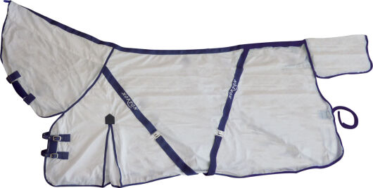 Atmungsaktive, integrale Netzdecke aus weichem und leichtem Mesh-Polyester. Ausgestattet mit einem Combo-Halsteil mit dreifachem Klettriemenverschluss und praktischer Halfter-Befestigungsschlaufe. Breit umhüllender Schweiflatz.Brustteil, Halsteil und Schweiflatz mit Polyester-Taftstoff unterlegt, um Scheuerstellen zu vermeiden. Dehnfalte, doppelter Klettriemen- und Hackenbrustverschluss. Verstellbare Kreuzgurte und abnehmbare Schweifkordel.