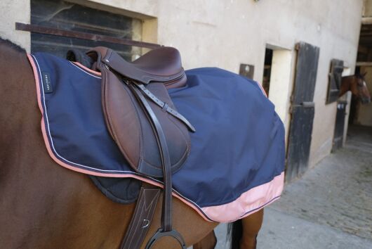 Aus wasserdichtem 600 Denier Ripstop Polyester, atmungsaktiv und wasserdicht. Futter aus anti-pilling Micro Polar Fleece. Sattel- und Beinausschnitt für einen optimalen Schenkelkontakt. Selbsthaftender Widerristverschluss und Schweifschnur.