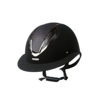 Stilvoller und hochwertiger PU-Samt bezogener Helm mit 2 herausnehmbaren Linings und verstellbarer Größe. Glänzender Gun-Metal-Einsatz, ABS-Außenschale, Polypropylen-Schirm, EPS-Liner, Komfortpolster und Polyester-Gurtband mit Schnallen-Haltesystem. EPS/EN 1384:2012, geändert durch VG1 01.040 2014-12. Zertifizierung SGS FIMKO OY.